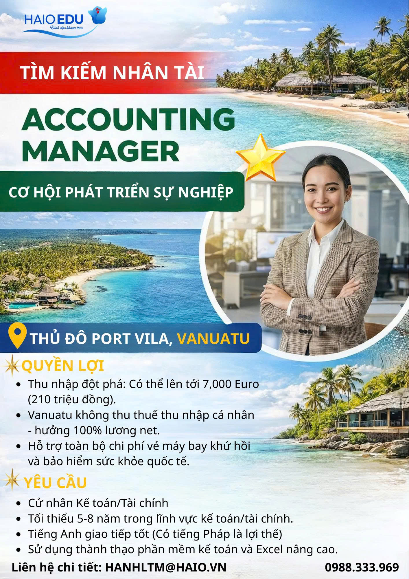 Haio Education hiện đang tìm kiếm Accounting Manager (Quản lý Kế toán – Tài chính) làm việc tại thủ đô Port Vila, Vanuatu – điểm đến quốc tế nổi tiếng với môi trường sống trong lành, cảnh quan nghỉ dưỡng đẳng cấp và nền kinh tế đang phát triển mạnh về du lịch, logistics, thương mại biển.